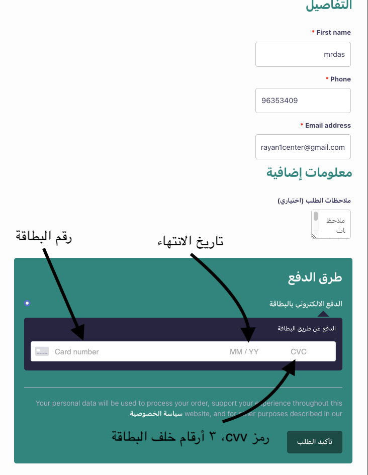 اكتب اسم وهاتف الفوترة، ثم اكتب بيانات البطاقة البنكية للدفع، ثم اضغط (تأكيد الطلب)
